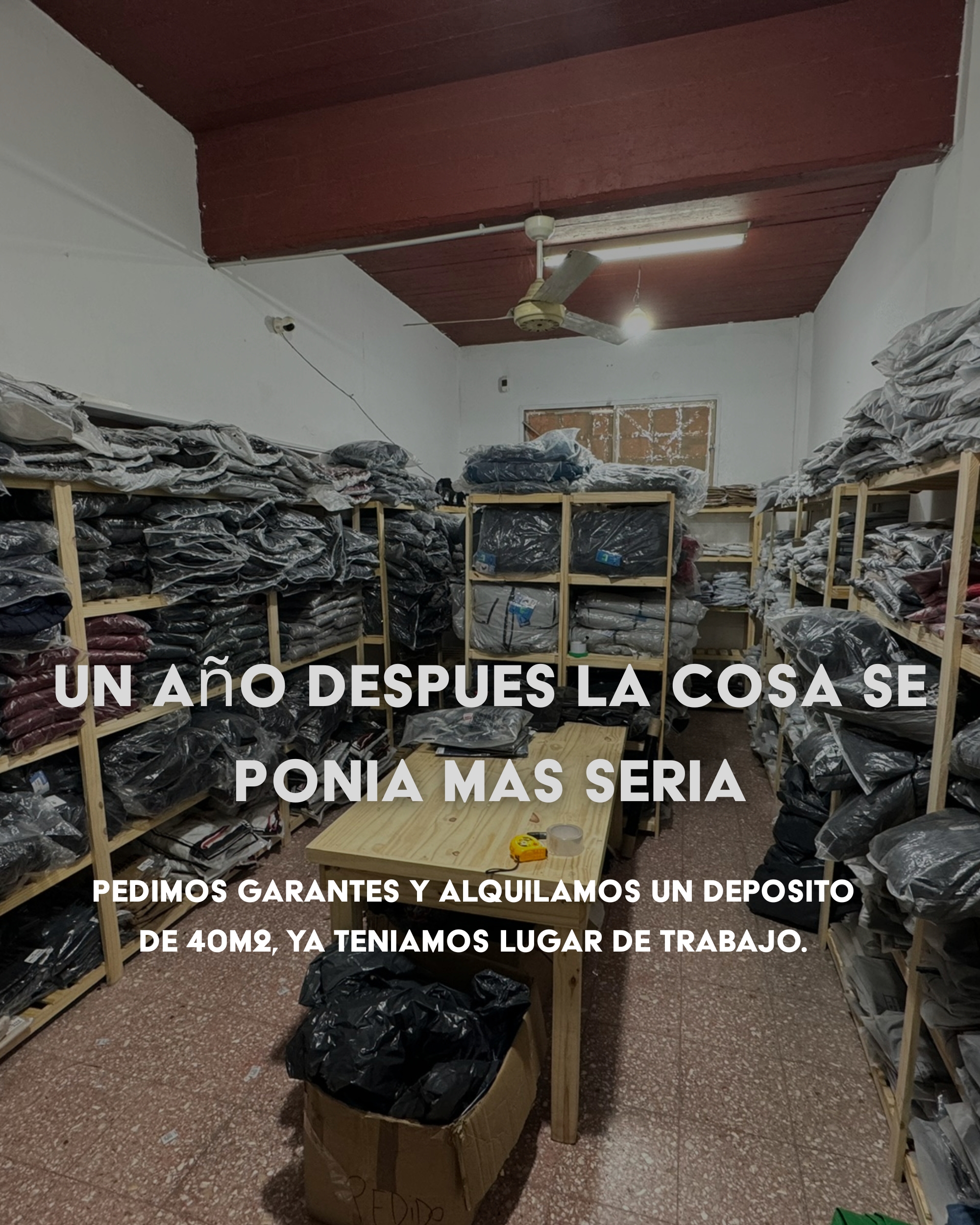El esfuerzo dio sus frutos. Lo que empezó en ese pequeño cuarto creció tanto que ya no cabía entre esas cuatro paredes. Un año después, dimos el siguiente paso: pedimos garantes y alquilamos nuestro primer depósito de 40m². Por fin teníamos un lugar de trabajo real. El sueño se estaba materializando.